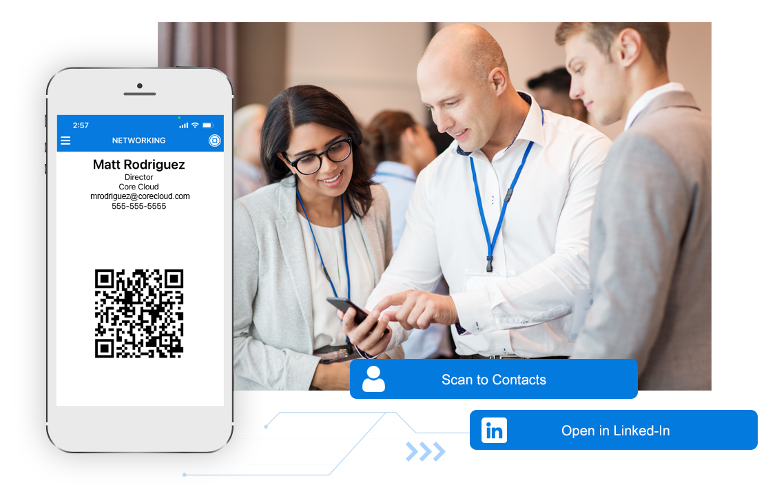 Attendees can mutually scan each other's QR codes for peer-to-peer networking, creating contact cards, and to link to each other on Linked In. Social Feed allows attendees to post pictures and comments to social networks.